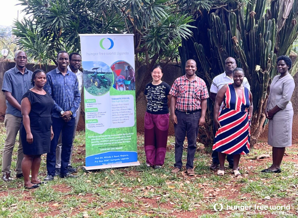 ウガンダ支部のスタッフ、事務所の庭にて。HFWのビジョンなどが書かれているバナーを囲んで。