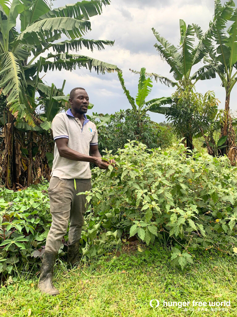 カブンバ協同組合のスーパーバイザー委員会のアレックスさんが、組合のデモ農園の作物を紹介している様子