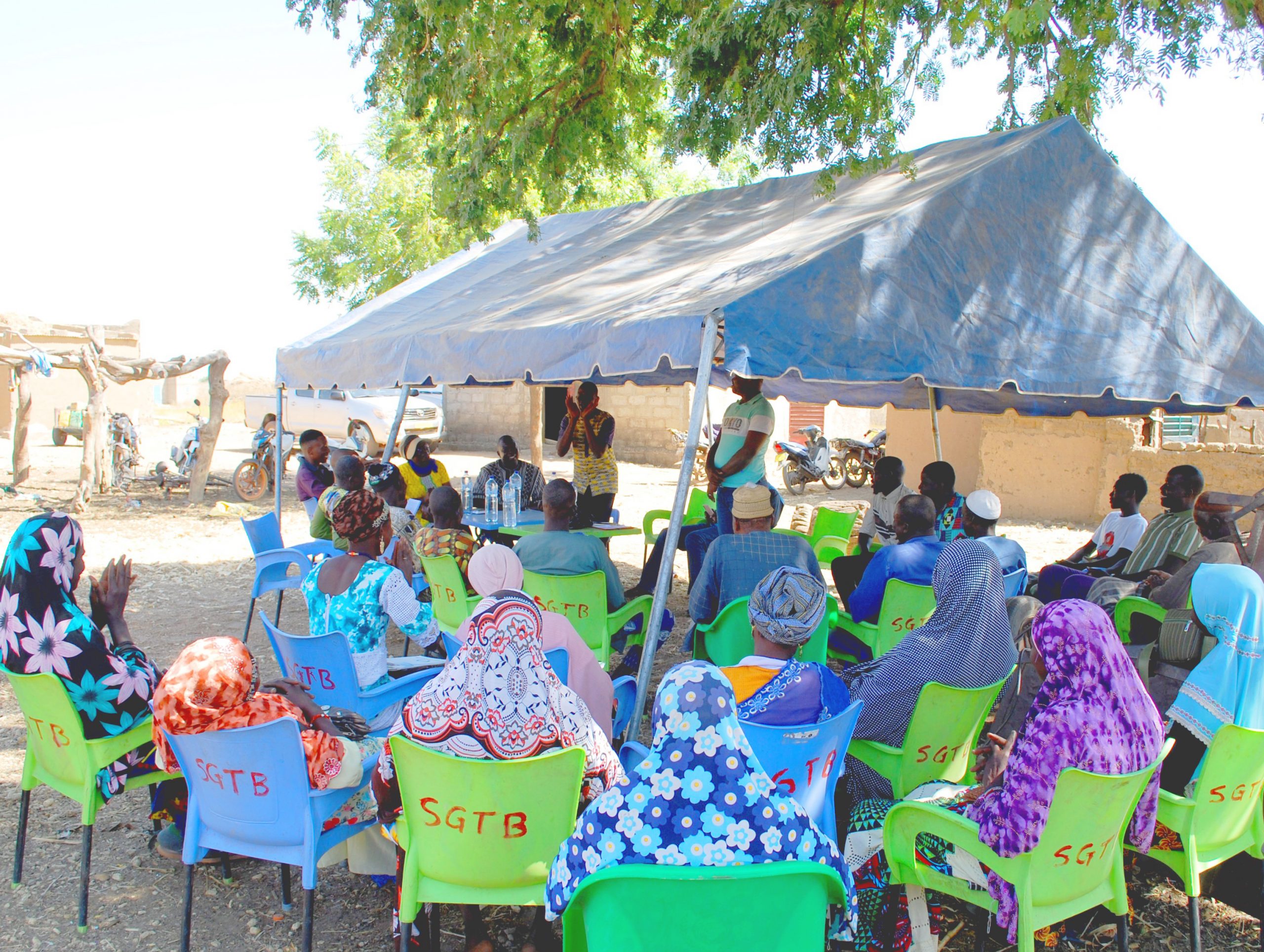 ワルドゴ村に到着したベナン支部の職員たち(標識左)と、ブルキナファソ支部の職員(標識右)。真ん中の黄色い服の女性がベナン支部ファトゥ事務局長、その右のシャツを着た男性がブルキナファソ支部フランソワ事務局長