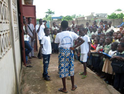 初回はHFWやYEHの活動を紹介。2回目にいよいよ寸劇とDVDでわかりやすく「ゴミ問題」を説明。公用語であるフランス語だけでなく、理解しやすい現地語のフォン語も使いました。寸劇は、ゴミが散乱した場所で売られている不衛生な食べ物を食べてお腹を壊すというストーリーで、100名以上の生徒と教員が熱心に見てくれました。どんなことがわかったか尋ねると、みんなが競うように手を挙げ、それぞれに学びとったことを次々に話してくれました。生徒たちが必修授業で習った知識が、DVDや寸劇によってリアリティを持ち理解されたようでした。