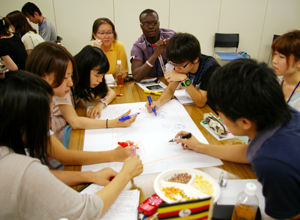 今回のイベントは、日本語・英語・フランス語が飛び交い国際色豊か。背景が違うすべての国の意見が聞けるように、グループのメンバーを途中で変更する、ディスカッションする時は模造紙に絵を描いて自分の意見を伝えるといった工夫がありました。3時間に及んだイベントの終了後には、海外メンバー・日本メンバー共にとても充実した表情でした。
