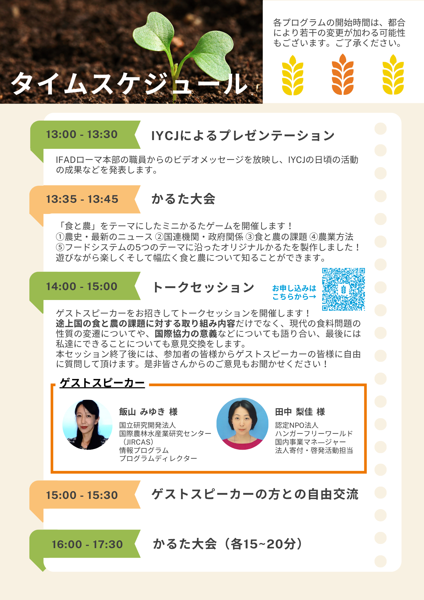 【プログラム概要】目玉企画のトークセッションは14:00~15:00に開催。15:00~15:30はゲストスピーカーの皆さんと参加者が自由に交流して頂ける時間になっています。