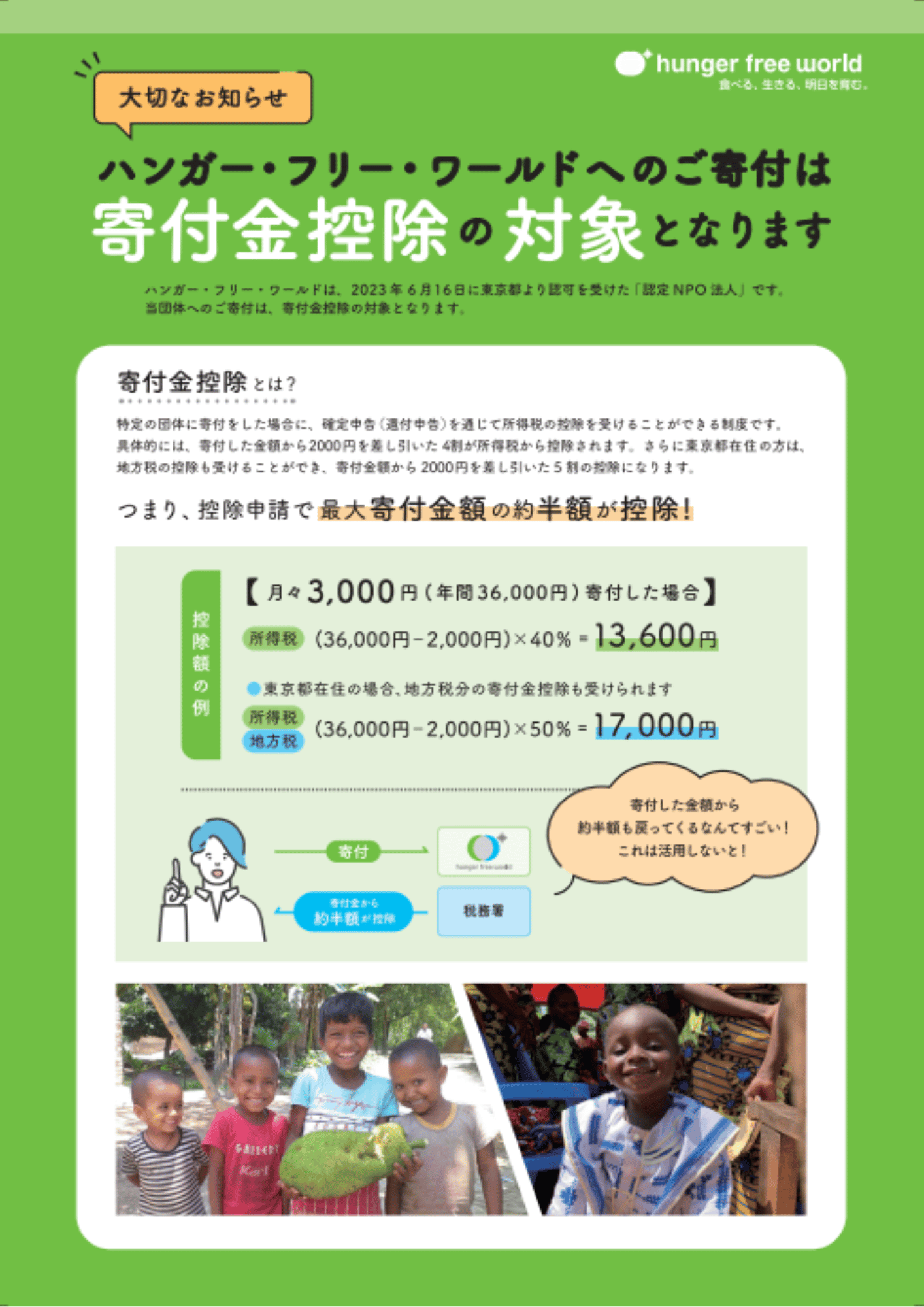 HFWは、東京都より2023年6月16日付で「認定NPO法人」として認可されており、当団体へのご寄付は税制上の寄付金控除(優遇措置)の対象となります。 控除申請を行うと、確定申告(還付申告)を通じて、最大寄付金額の約半額が控除されます。